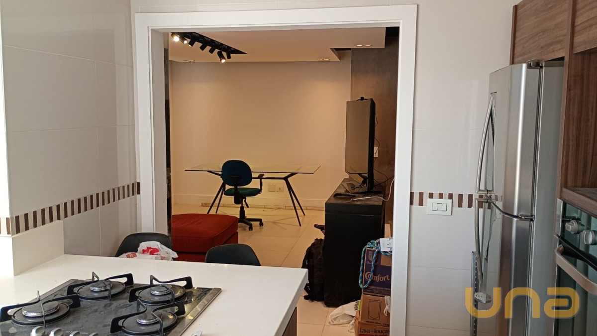 Cozinha estilo americana com passa-prato, fogão cooktop e geladeira;