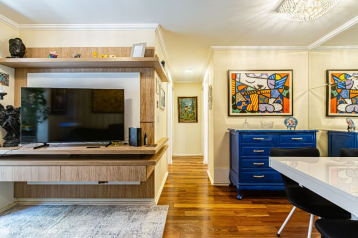Com 2 quartos (sendo 01 suite com cabeceira e painel frontal), banheiro social com armarios, box e persianas. Sala para 02 ambientes com painel e rack, jogo de